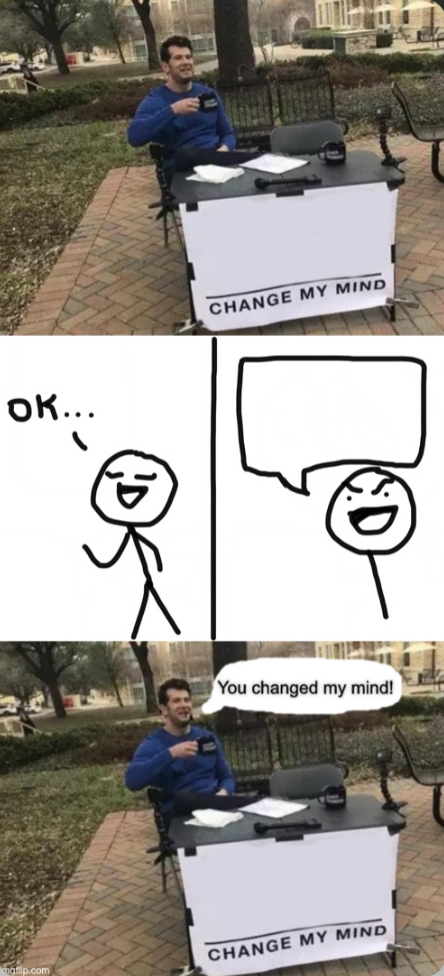 Change my mind gifs get the best gif on giphy. Use the change my mind meme template to create your meme with our free and easy to use meme generator. The most modern meme maker on the . Find the newest change my mind meme generator meme. The best memes from instagram, facebook, vine, and twitter about change my mind meme blank. Explore change my mind gifs. The 27 best change my mind memes . The best memes from instagram, facebook, vine, and twitter about change my mind meme generator. Template · funny · imgur · reddit · steven crowder change · xyz · views · subreddit. Meme template change my mind gif. Make change my mind memes or upload your own images to make custom memes. Imgflip pro gif maker meme generator blank meme templates chart maker demotivational . I m having a nice day so i made a meme template of hol.